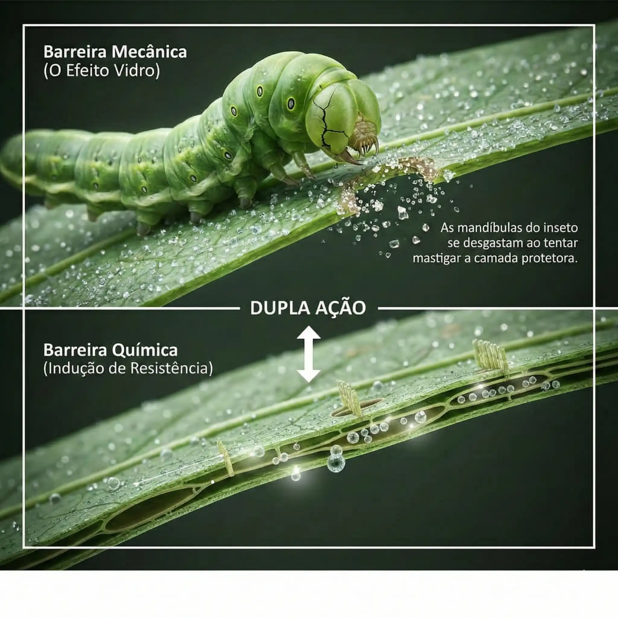 1. Barreira Mecânica (O Efeito “Vidro”): O silício se acumula abaixo da cutícula da folha (a “pele” da planta), formando uma camada dupla de sílica-cutícula. Para a lagarta, mastigar essa folha é como tentar comer um sanduíche com areia ou vidro moído. Isso causa o desgaste das mandíbulas do inseto, dificultando a alimentação e reduzindo drasticamente o consumo foliar.