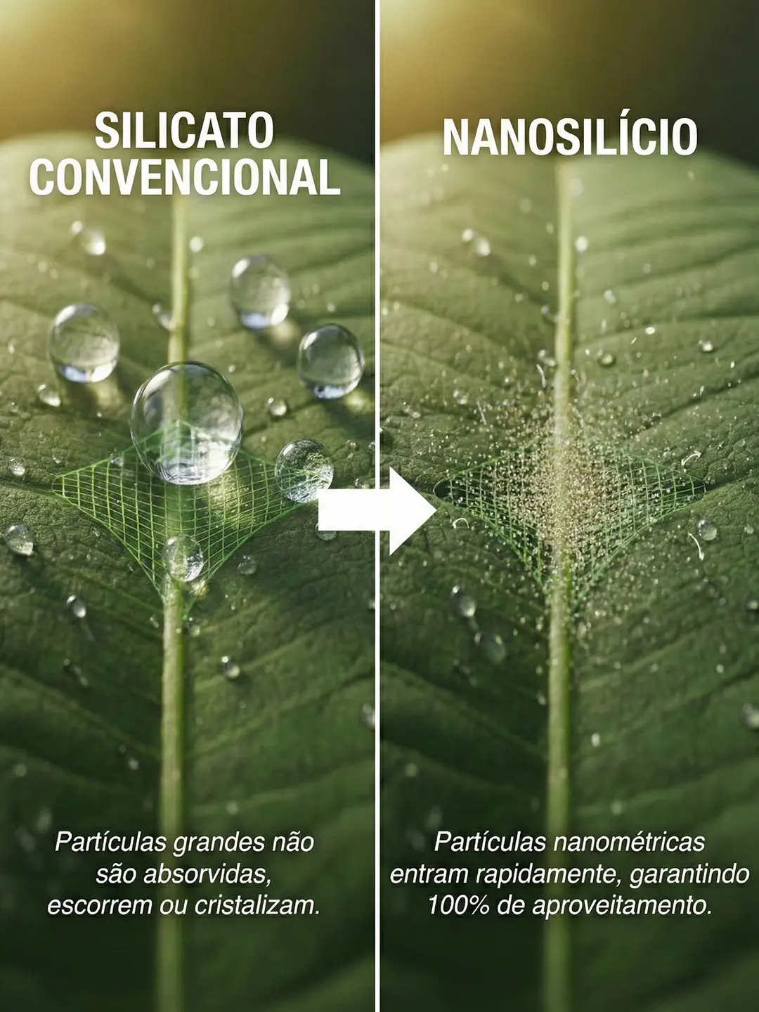 O nanosilício funciona assim: devido ao tamanho reduzido, ele é absorvido pelos estômatos e cutícula da folha com velocidade muito superior, garantindo que a planta aproveite quase 100% do produto aplicado, sem as perdas comuns por escorrimento ou cristalização na superfície.